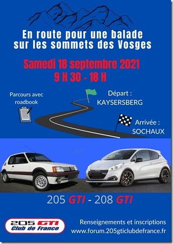 Notre ami JF du 205 GTI CDF nous propose une sortie 205/208 GTI le Samedi 18 Septembre dans les HT Vosges.