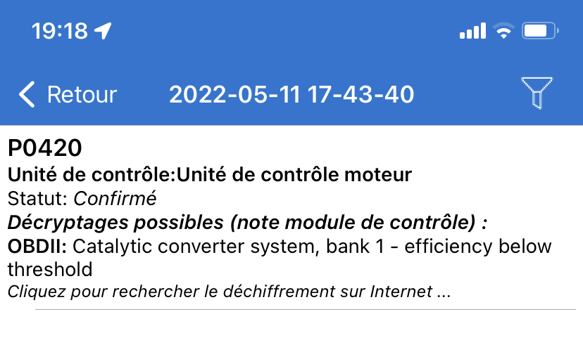 Du coup, j'ai branché le lecteur, l'appli et tout le tralala et j'ai réussi a trouver le code erreur P0420: défaut catalyseur.